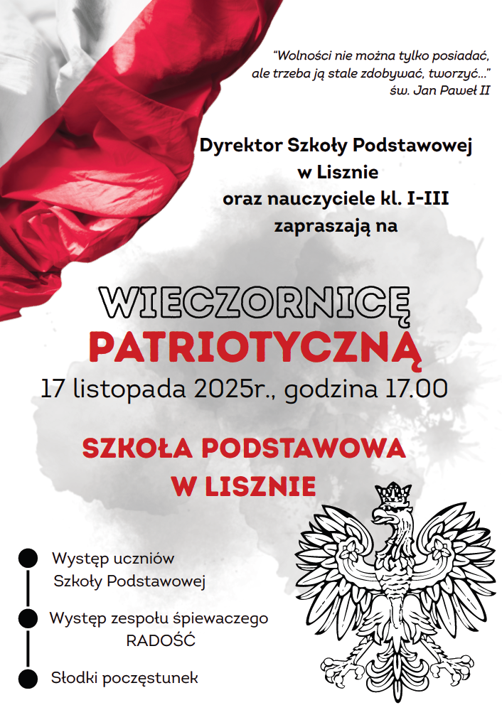 Zaproszenie na Wieczornicę Patriotyczną w Szkole Podstawowej w Lisznie 17 listopada o godzinie 17.00.